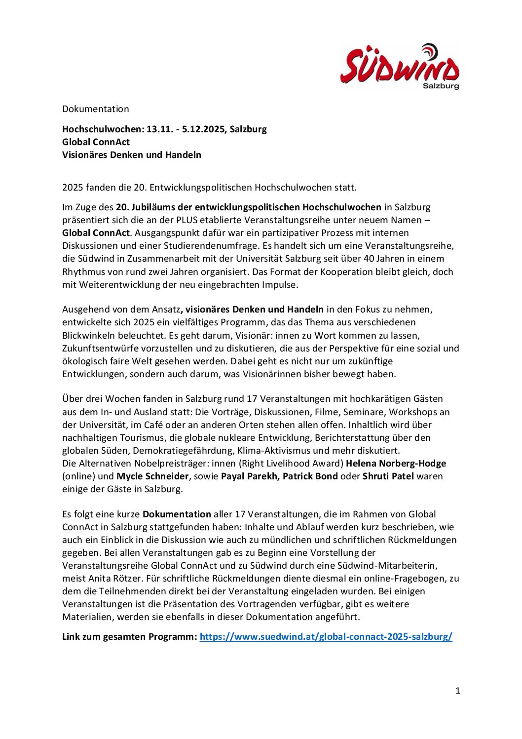 Im Zuge des 20. Jubiläums der entwicklungspolitischen Hochschulwochen in Salzburg präsentiert sich die an der PLUS etablierte Veranstaltungsreihe unter neuem Namen – Global ConnAct. Ausgangspunkt dafür war ein partizipativer Prozess mit internen Diskussionen und einer Studierendenumfrage. Es handelt sich um eine Veranstaltungsreihe, die Südwind in Zusammenarbeit mit der Universität Salzburg seit über 40 Jahren in einem Rhythmus von rund zwei Jahren organisiert. Das Format der Kooperation bleibt gleich, doch mit Weiterentwicklung der neu eingebrachten Impulse.