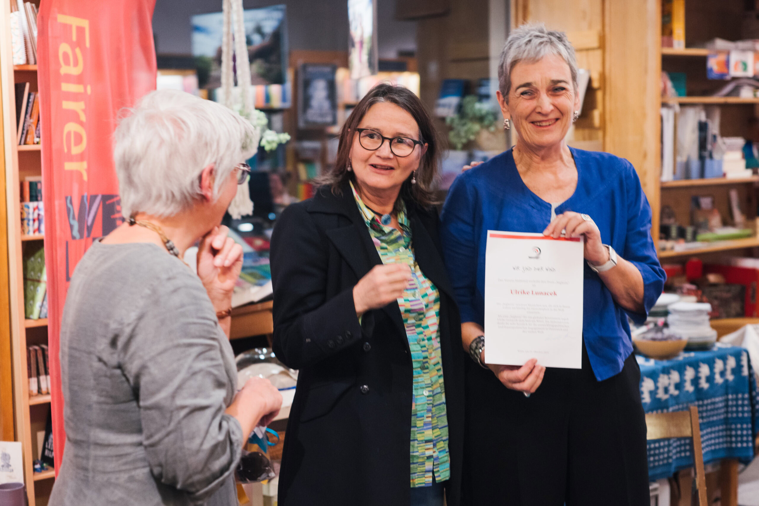 Wien, am 24. Oktober 2025. Der Verein Südwind Entwicklungspolitik Wien ehrte gestern Abend Ulrike Lunacek mit der Auszeichnung „Die Seglerin“ für ihren herausragenden Einsatz für Frauenrechte, soziale Gerechtigkeit, internationale Solidarität und die Rechte von LGBTIQ-Personen. Die Veranstaltung fand in der Südwind Buchwelt in der Schwarzspanierstraße in Wien statt, mit Gästen aus Politik und Zivilgesellschaft, darunter auch politische Weggefährt:innen wie Monika Vana (Ehemaliges Mitglied des Europäischen Parlaments, Grüne) und Nationalratsabgeordneter Lukas Hammer (Grüne).