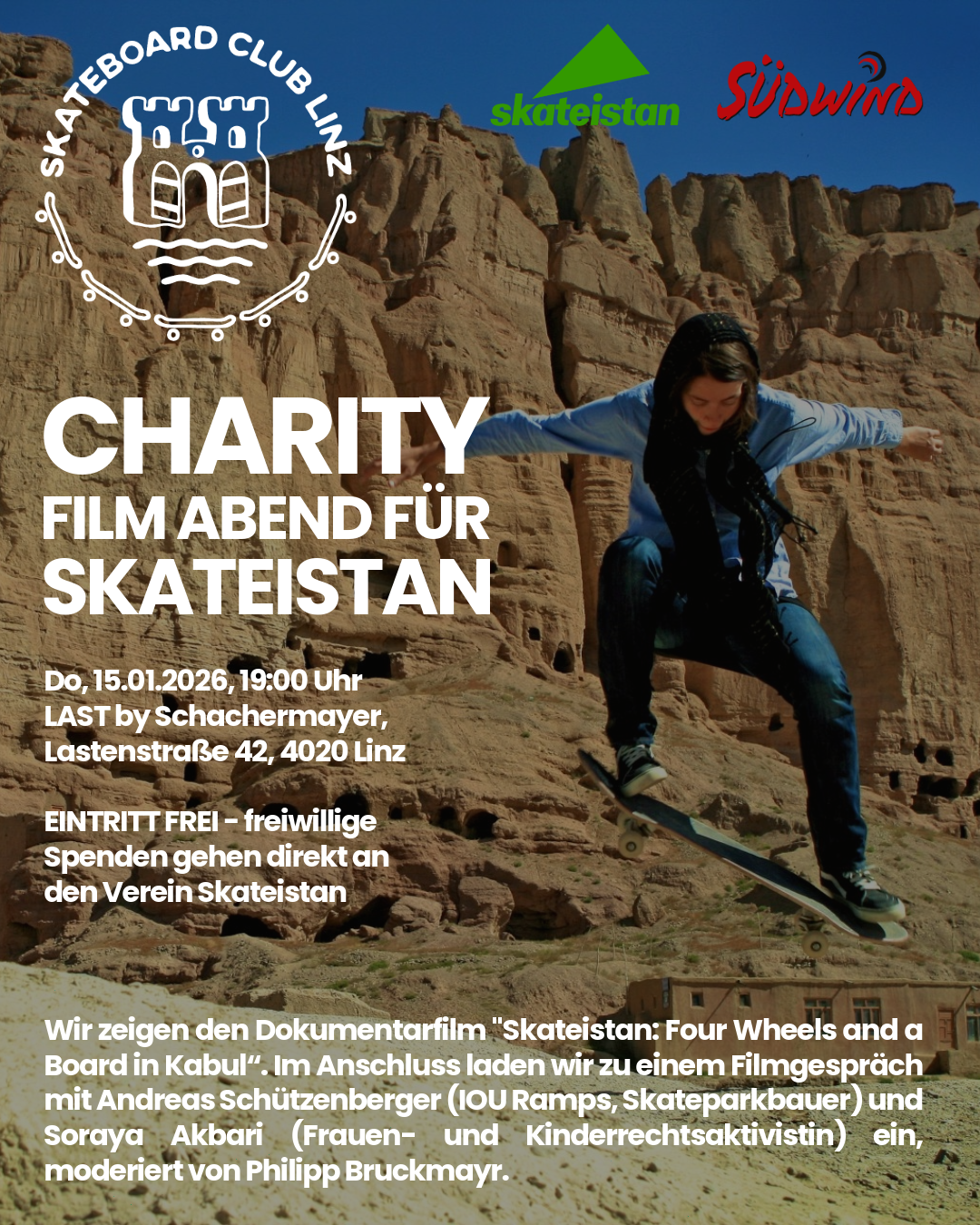 Im Anschluss laden wir zu einem Filmgespräch mit Andreas Schützenberger (IOU Ramps, Skateparkbauer) und Soraya Akbari (Frauen- und Kinderrechtsaktivistin) ein, moderiert von Dr. Philipp Bruckmayr.