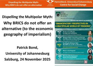 Patrick Bond is a political economist and ecologist, professor at the University of Johannesburg. He researches African political economy, global justice, and eco-social issues. A sharp critic of neoliberalism and of the failure of capitalist states to address social justice and environmental degradation, he works with social movements worldwide. Amongst others he has held academic posts in South Africa and Korea, and directed the Centre for Civil Society in Durban.