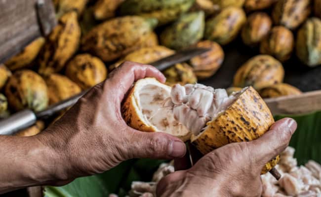 Hände, die eine Kakaobohne öffnen.